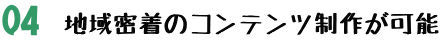 ⇒地域特性に詳しい人材が対応するため、地元ならではの表現や文化、ニュアンスを的確に捉えたコンテンツ制作ができます。